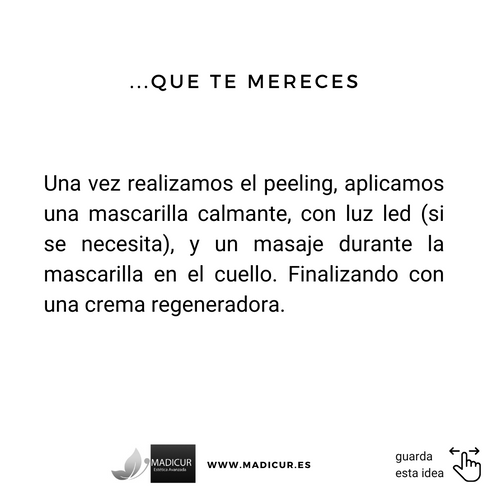 👉Una vez realizamos el peeling, aplicamos una mascarilla calmante, con luz led (si se necesita), y un masaje durante la mascarilla en el cuello. Finalizamos con una crema regeneradora.